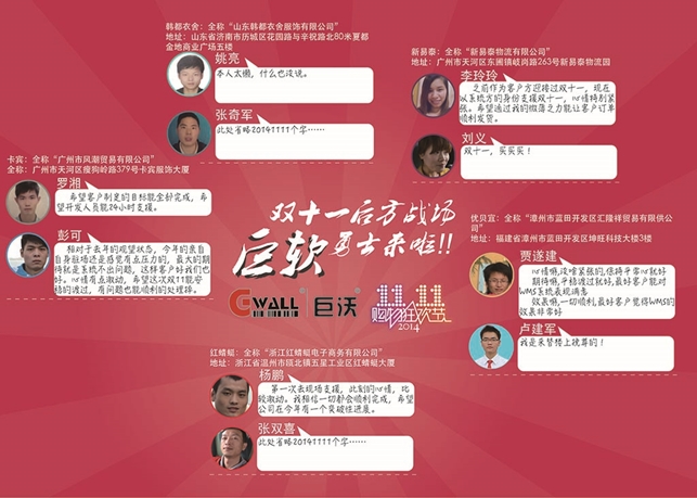 他們立下豪言壯語(yǔ),寫下心愿祝福,一一表達(dá)了自己對(duì)雙十一的期望。他們低調(diào)中帶著誠(chéng)懇的語(yǔ)言,他們空白中隱含千言萬(wàn)語(yǔ)的字里行間,字字句句述說(shuō)了對(duì)雙十一的雄心壯志!