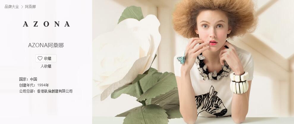 AZONA品牌始創(chuàng)于1993年,是一個(gè)為優(yōu)雅時(shí)尚年輕女士所喜愛的品牌,直至今天,已于亞洲地區(qū)設(shè)立超過130家店鋪,且數(shù)量正每月增長中。AZONA(阿桑娜)穩(wěn)站在時(shí)裝世界之最前線,每個(gè)時(shí)裝季度,都會準(zhǔn)備一個(gè)充滿摩登設(shè)計(jì)、年輕又時(shí)尚的衣櫥,以反映大都市氣氛的都市時(shí)裝。