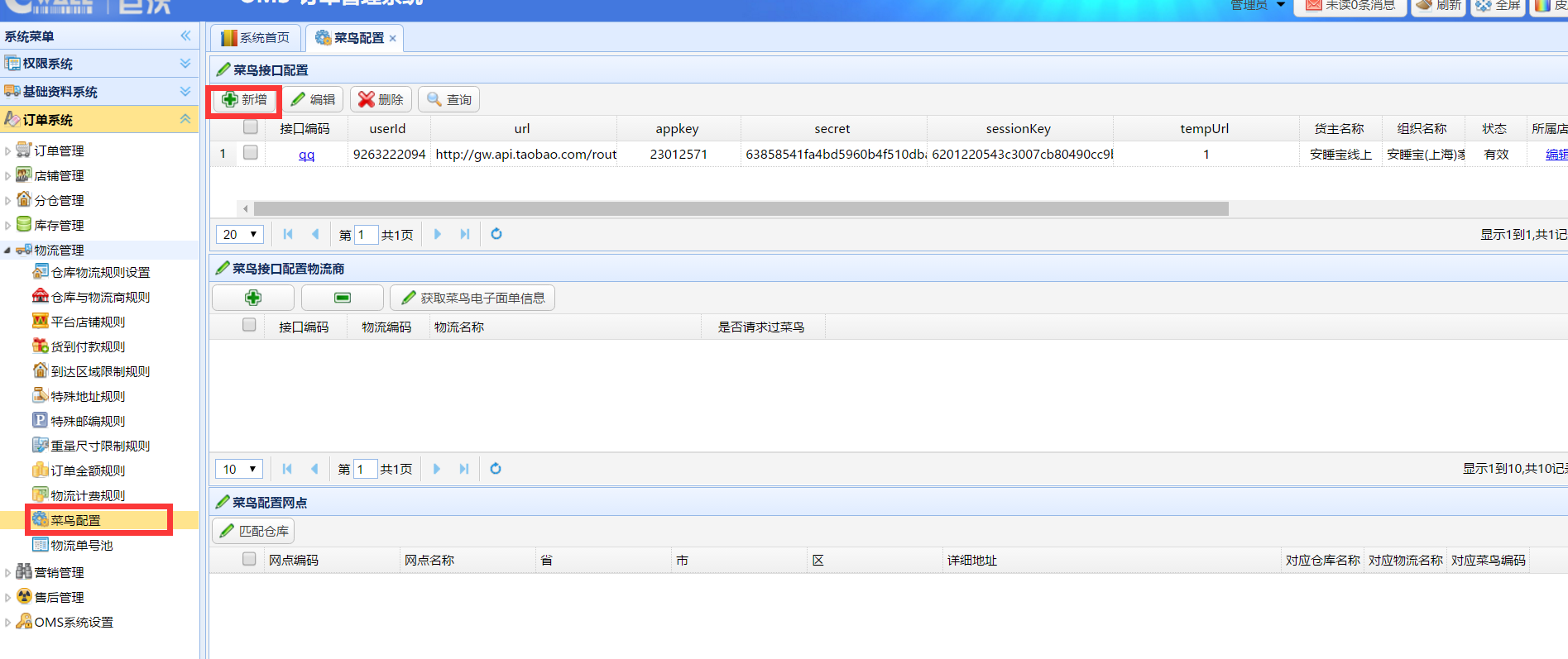 登入OMS系統(tǒng),進(jìn)入訂單系統(tǒng)-物流管理-菜鳥(niǎo)配置,點(diǎn)擊新增,如圖: