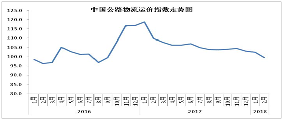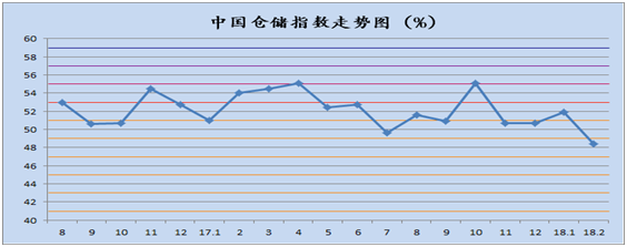 中國(guó)物流與采購(gòu)聯(lián)合會(huì)發(fā)布的2018年2月份中國(guó)物流業(yè)景氣指數(shù)為50%,較上月回落4.2個(gè)百分點(diǎn);中國(guó)倉(cāng)儲(chǔ)指數(shù)為48.4%,較上月回落3.5個(gè)百分點(diǎn);中國(guó)公路物流運(yùn)價(jià)指數(shù)為99.6點(diǎn),比上月回落2.8%。
