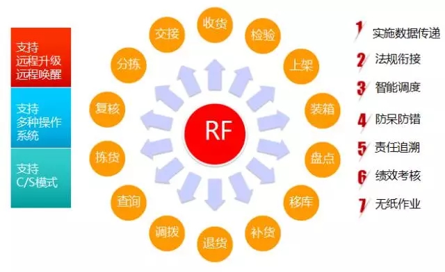 WMS如果缺少了RF系統(tǒng)的有力支持,倉儲(chǔ)水平未必能有大幅度的提高,完善的WMS是離不開RF系統(tǒng)支持的。因?yàn)?/span>WMS的高效率運(yùn)作,是以快速、準(zhǔn)確、動(dòng)態(tài)地獲取貨物處理數(shù)據(jù)作為其系統(tǒng)運(yùn)行的基礎(chǔ)。而RF系統(tǒng)使得WMS實(shí)時(shí)數(shù)據(jù)處理成為可能,從而大大簡(jiǎn)化了傳統(tǒng)的工作流程。